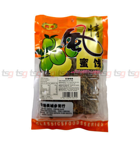CFS Preserved Rose Prune (Slice) is a traditional snack made from dried sliced plums, carefully preserved with sugar, salt, citric acid, and a gentle hint of rose essence. It offers a balanced sweet and sour flavor with a soft, chewy texture and a refreshing floral aroma. Ideal for soothing the throat, aiding digestion, or simply enjoying throughout the day.