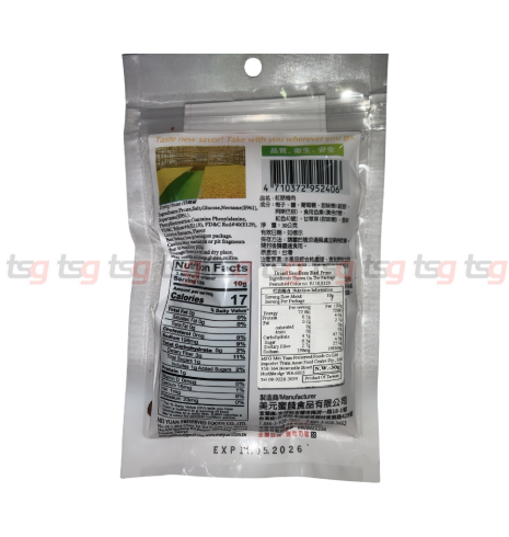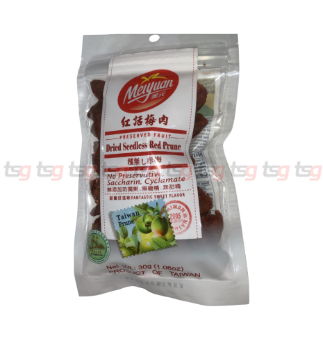 Meiyuan Dried Seedless Red Prune 30g captures the pure, natural sweetness of ripe red plums, gently dried to preserve their soft, luscious texture and rich fruity aroma — all without preservatives, saccharin, or cyclamate. Conveniently packed in a resealable 30g pouch, these tender, seedless prunes are perfect for on-the-go snacking, adding a vibrant touch to salads and breakfast bowls, or simply enjoying as a wholesome snack. Proudly made in Taiwan, Meiyuan delivers authentic quality and natural goodness in every delicious bite.